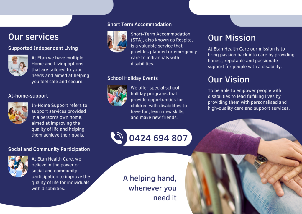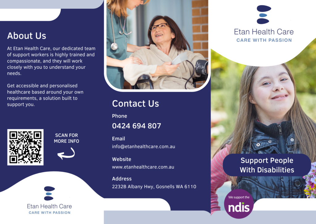 I designed a set of professional branding materials for Etan Healthcare, an NDIS provider committed to delivering high-quality, person-centred disability support services. The project included a well-structured Z-fold flyer, an eye-catching A4 flyer, and a sleek business card. Each piece was thoughtfully crafted to reflect the organisation’s values of care, inclusivity, and empowerment. I used a warm and approachable colour palette, clear typography, and consistent branding elements to ensure visual harmony across all materials. These designs were created to effectively communicate Etan Healthcare’s services while building trust and connection with participants and their families.