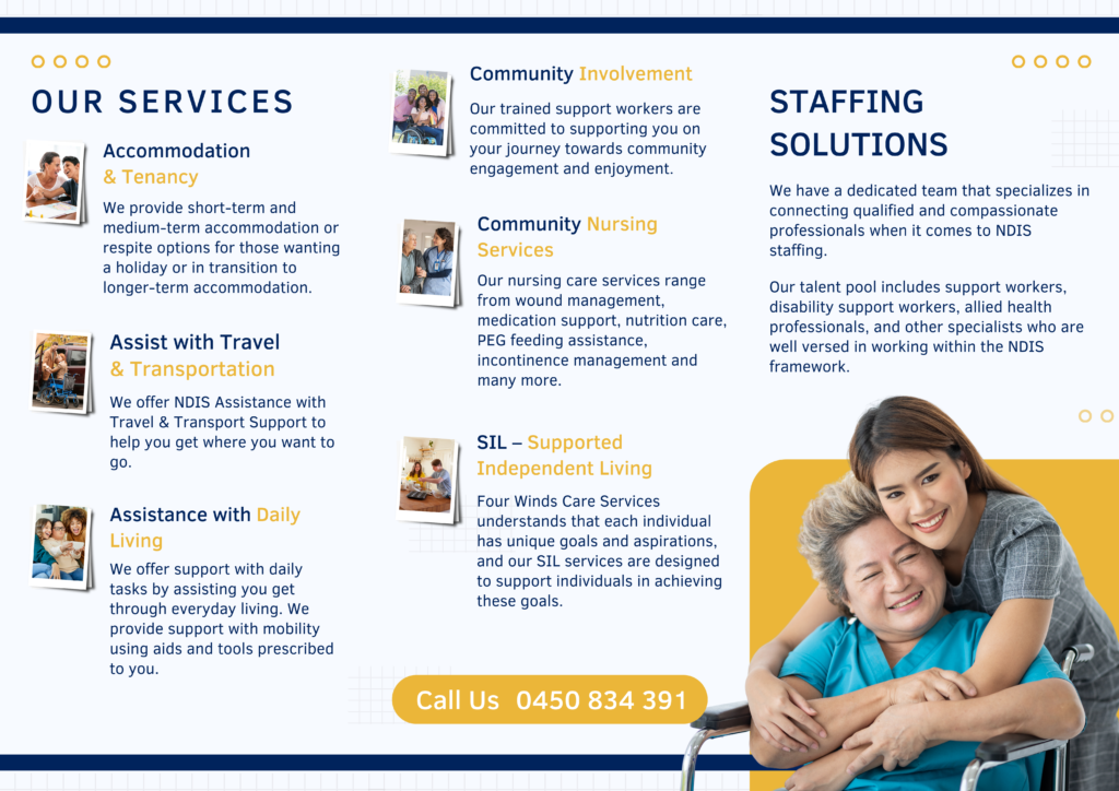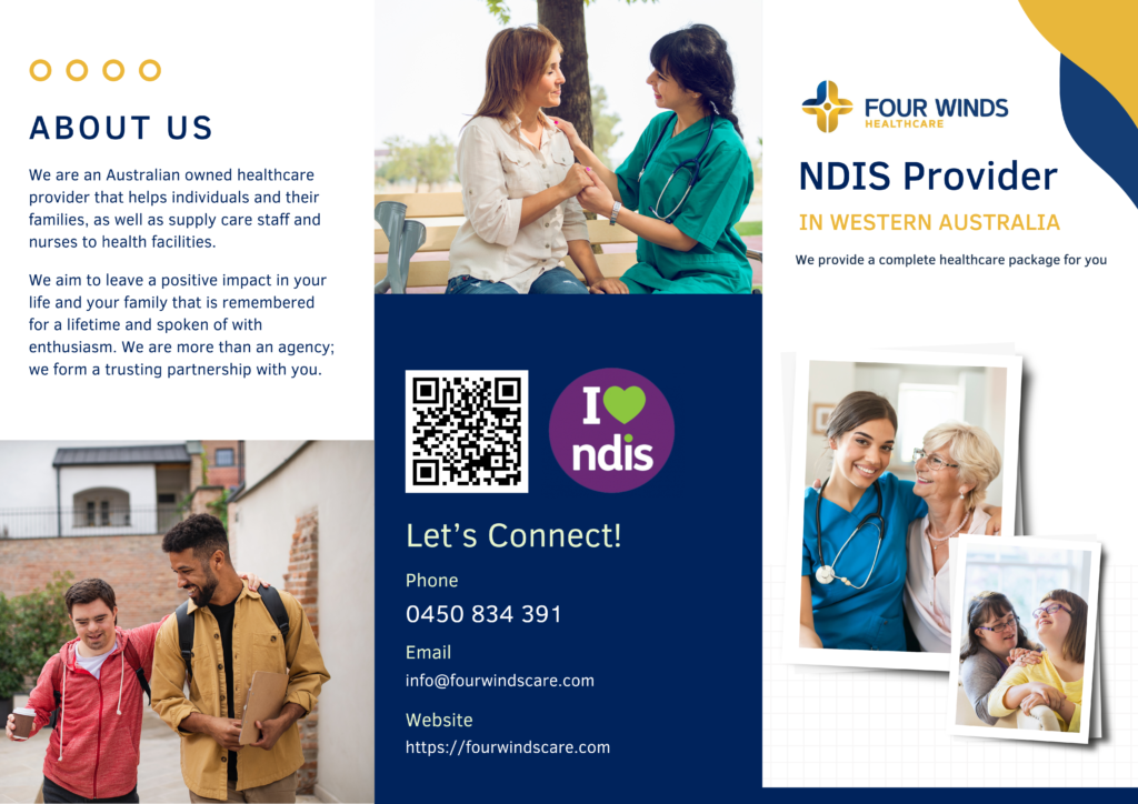 I have designed a Z-fold flyer and a professional business card for Fourwind Healthcare, an NDIS provider dedicated to delivering high-quality support services. The designs were created to reflect the organisation’s commitment to care, compassion, and accessibility. I focused on a clean, approachable layout, ensuring clear communication and a strong visual identity that resonates with both participants and their families. These materials were crafted to build trust and enhance Fourwind Healthcare’s professional presence in the disability support sector.